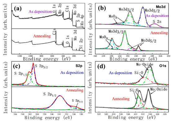 The XPS spectra of the MoS2 films prepared at 200 °C without annealing and 600 °C annealing are shown in Figure 7. In the deposition full spectrum, the binding energy of 230.0 and 161.5 eV correspond to Mo3d and S2p, respectively, as shown in Figure 7a. Two weak peaks are easily found at 35.0 and 37.0 eV, indicating the existence of the Mo4p valence state in the films. In the full spectrum after annealing at 600 °C, the S2p peak at 161.5 eV disappears, and a weak peak appears at 155 eV. The sharp O1s peak appears in the figure, and the Si2p peak appears at the binding energy of 106 eV. This condition shows that high-temperature annealing has a great influence on the valence of elements in the films. To analyze the chemical composition of the MoS2 films in depth, Lorentzian fitting was performed on the peaks in each of the two full spectra. The Mo3d peak before annealing can be fitted into two peaks, as shown in Figure 7a. The binding energy of 228.5 and 231.4 eV correspond to Mo3d5/2 and Mo3d3/2, respectively [41,42]. The presence of peaks at 232.1 and 234.8 eV can determine the presence of Mo6+ and indicate the presence of MoO3 in the film [41]. However, the peak area of Mo6+ is smaller than other peak areas, indicating that the main component of the films is still MoS2. The annealed Mo3d can still fit into a double peak, and the area of the Mo3d5/2 peak is immensely reduced. The MoOx peak significantly increases. This condition shows that free molybdenum ions increase and the high temperature activates the oxygen on the film surface after high-temperature desulfurization. Therefore, the two react to form molybdenum oxide. The grain boundaries in the annealed grain size enlarge, and the film impurities increase. After annealing, the binding energy of each peak shifts in parallel and moves by 1.0 eV to the low-energy direction, making the structure of the films stable. The S2p high-resolution spectrum and fitting are shown in Figure 7b. Before annealing, the S2p3/2 and S2p1/2 peaks of the film are at the binding energy of 161.1 and 162.3 eV, respectively, thereby determining the presence of S2− in the MoS2 films [43,44]. After high-temperature annealing, the S2p3/2 and S2p1/2 peaks immensely shift toward the binding, reducing the binding energy and making the structure stable. High-temperature desulfurization will improve the synthesis of MoS2 [45]. Figure 7c shows the high-resolution spectrum of O1s and the comparison between the two after fitting. The oxygen peak is activated under high-temperature conditions and produces many MoO2 impurities. Before and after annealing, the Si–O bonds with oxygen peaks at 531.58 and 533.9 eV originate from the SiO2 photoelectrons of the substrate [46].