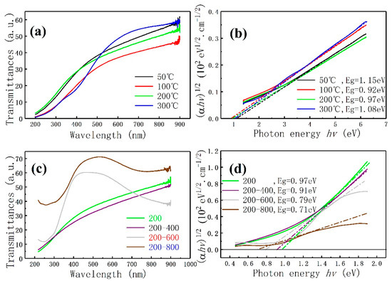 The transmission spectra of MoS2 films prepared at different deposition temperatures in a quartz substrate are shown in Figure 8a. In accordance with the transmission spectrum of Figure 8a combined with the SEM and XRD analyses of the MoS2 films, the film with high crystallinity has better transmittance. From the transmission curves of 100 °C, 200 °C, and 300 °C, the deposition temperature has a great influence on the film with “stripe” structure. Figure 8c shows the transmission spectrum of MoS2 films deposited at 200 °C with annealing at 400 °C, 600 °C, and 800 °C. As shown in Figure 2c, the surface structure of the films annealed at 200–400 °C is similar to that before annealing (see Figure 1c). The transmission curve is similar to the transmission curve before annealing but the transmission rate is reduced. The surface morphology of the films after annealing at 200–600 °C completely changes, resulting in an abrupt transmission curve. They are B and A exciton peaks at 200 nm to 350 nm and 650 nm to 850 nm, respectively. The two peaks are the transition regions of A and B excitons in the Brillouin zone and are caused by the blue shift of the K point in the Brillouin zone [16,47,48]. Therefore, a strong transmission peak appears at 400 nm to 650 nm. The spectral transmittance significantly increases with the increase in annealing temperature. This condition may be attributed to two reasons: First, the increase in annealing temperature will cause the spectral absorption rate of A and B excitons to decrease. Figure 8c shows that the annealing temperature will affect the K point in the Brillouin zone of MoS2. Second, annealing desulfurization changes the surface morphology and crystal structure of the film, resulting in a drop in its optical properties.