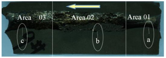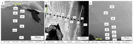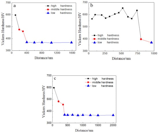 - It was found that three layers were formed in the lateral direction of the crater, namely, the martensite layer, the deformation strengthening layer, and the original structure layer. Moreover, the martensite layer thickened first and then thinned in the longitudinal direction of the crater.