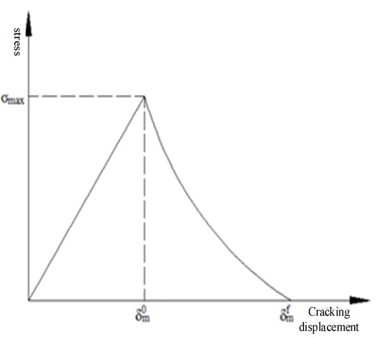 In this study, the modeling of the interface layer uses a cohesive force model based on cohesive elements. The simulation of cohesive zone elements for utilization in FE models is provided by [31]. This type of element was also adopted by Tvergaard [32] in his study for simulating de-bonding phenomena of the fiber matrix interface whisker reinforced aluminum metal matrix composite. The failure process of the cohesion force model specifically shows that the stress increases as the cracking displacement increases and the damage begins when it increases to the highest point; then the stress appears to decrease and the component enters the damage expansion phase; when the stress value ends When it is reduced to zero, the component completely destroys the failure [33]. The concrete constitutive model of the interface layer adopts an exponential model. As shown in Figure 1, the tension and displacement are linear before the material reaches the strength limit, and the tension and displacement are exponential after the material reaches the strength limit.