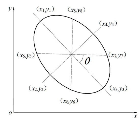 - Cover the ellipse that was generated with a slightly larger ellipse (long and short axes are respectively 1.2 times of the original ellipse) as the recognition area, which is called covering ellipse. To reduce the amount of calculation, select eight special positions of the ellipse ((xi, yi), i = 1–8) as a reference point, as shown in Figure 2. If the reference point of the newly generated ellipse is not included by the cover ellipse of the previous ellipse, it is determined that the overlay condition is satisfied. From the coordinate transformation equation, the coordinates of each reference point are calculated as shown in Equations (13)–(20):