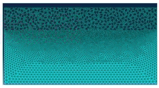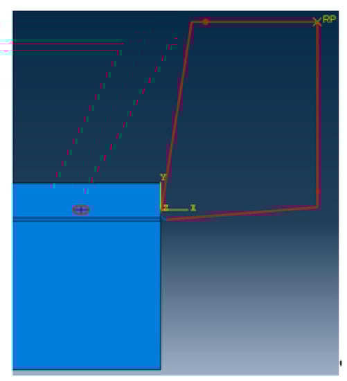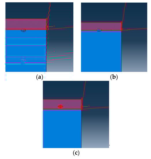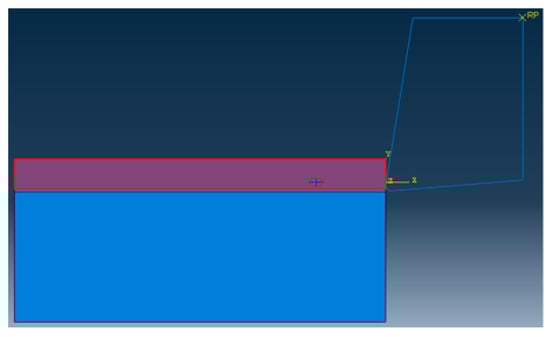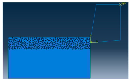 The meshing of the matrix was also divided into free meshes. The mesh type for the matrix in this model was used as a CPE3T. The matrix meshing, particle meshing, and interface layer meshing are shown in Figure 6, Figure 7 and Figure 8. Particles below the workpiece cutting layer have little effect on the simulation results; to improve the calculation efficiency, only the particles near the cutting layer were retained. The contact settings include the contact pattern of the tool with the cutting layer and the contact between the tool and the particles, as shown in Figure 9 and Figure 10.