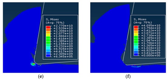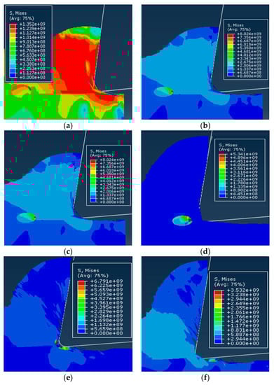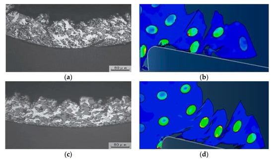 Figure 29 shows the change of chip morphology of the SiCp/Al composite material with a feed rate of f = 0.1 mm/r and different cutting speeds. It can be seen from the figure that at low speed, the crack penetrates from the free surface of the chip to the bottom of the chip. Figure 29a,b is simulated chips obtained through Finite element analysis method. As the cutting speed increases, the depth of the shear crack extension phenomena possesses the reducing trend Figure 29c–f are simulated chips obtained through Finite element analysis method. The degree of chip sawing is slowed down, and there is a significant change in the chip morphology of the material, but the particle aggregation effect is more obviously seen. This is due to increase in cutting speed, which will cause the increments in the chip flow rate and increases the material strain rate, resulting in particles that are more likely to accumulate in the shear zone. The aggregation of such particles is more likely to cause the initiation of cracks, leading to an increase in the number of cracks result in the number of saw-tooth phenomena increases during machining process. On the other hand, an increase in cutting speed will increase the amount of material removal rate per unit time, which increases the cutting temperature and improve the plasticity of the SiCp/Al composite material. As a result, the fracture crack will only extend a certain distance towards the tool tip, and the extension will stop at a place where the compressive stress on the shear surface is large enough.