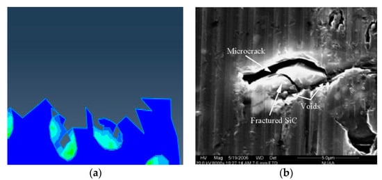 In cutting simulation research, two simulation models are commonly used. One is an equivalent homogeneous model. In the simulation, the size, shape, and position distribution of particles in SiCp/Al metal matrix composite material is a kind of material, which uses aluminum alloy as the matrix phase and SiC particles as the reinforcing phase. It has good wear resistance, good dimensional stability, corrosion resistance, low thermal expansion coefficient, good thermal conductivity, high specific strength, and other excellent material properties [1,2]. SiCp/Al composite possesses robust applications in several different areas. Some applications of SiCp/Al includes optical precision instruments, aerospace industries, medical device manufacturing, modern landing gears, electronic packaging, helicopter blades, sports equipment, and automotive parts manufacturing [3,4]. At the same time, the presence of high-hardness SiC particles makes SiCp/Al composites a difficult-to-machine material [5,6]. In the cutting process, the tool wear is severe, and the defects on the machined surface are more. These factors seriously hinder the several application of the SiCp/Al composite material [7,8].