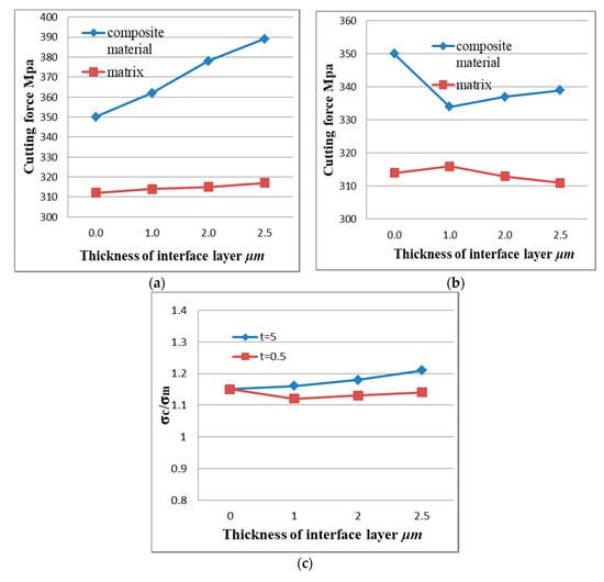 - The cutting state of the particles at different positions with respect to the tool cutting path was studied. The results show that the failure mode of the particles is mainly brittle fracture when it is facing the cutting path. The brittle fracture and the delamination of the particles from the matrix are mainly below the cutting path. The delamination of the particles and the matrix is mainly above the cutting path. The influence of interface layer on the cutting and strengthening of SiC particles was analyzed. The results show that the interface layer has a significant effect on the stress and strain transfer in the SiCp/Al metal matrix composite during the cutting process. For the flexible interface model, the enhancement effect does not change significantly with the increase of the interface thickness. For the rigid interface model, the enhancement effect is significantly better than without the interface layer model, and the enhancement effect increases as the thickness of the interface layer increases.