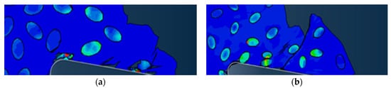 In cutting simulation research, two simulation models are commonly used. One is an equivalent homogeneous model. In the simulation, the size, shape, and position distribution of particles in the material are neglected and described by the material constitutive equation. The mechanical behavior of the composite material as a whole [9,10,11]; another model is the multiphase mixing model. Considering the morphology and distribution of the particles, the material properties of the particles and the matrix are defined respectively, which can simulate the interaction between the particles, etc. [12,13]. The partial failure behavior can also simulate the overall mechanical behavior in the composite cutting process [14,15].