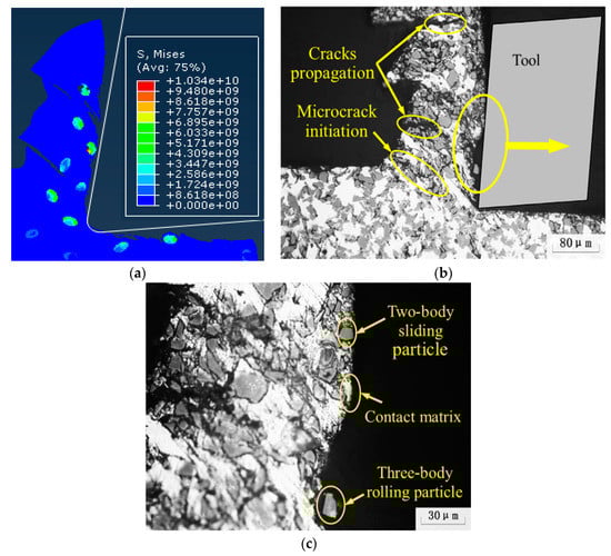The chip morphology varies with particle size and cutting parameters: (a) The simulation of the chip formation of SiCp/Al. However, Chip formation in the machining of 2024Al/40%SiC-30 μm composites cutting speed of vc = 120 m/min and feed rate of f = 0.1 mm/rev, (b) a micrograph of the chip root, (c) an enlarged view of the three-phase friction at the tool–chip. (b,c) Adapted with permission from ref. [50] Copyright 2018, Elsevier.