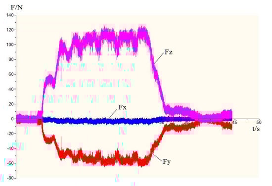 This experiment uses DynoWare software to process the cutting force measurement results. The change trend of the cutting force in each group of experiments was roughly the same. Taking the third group of experiments as an example, the curve of the cutting force as a function of time is shown in Figure 32. In the figure, Fx is the deep-cut resistance, Fy is the feed resistance, and Fz is the main cutting force. From the change in cutting force, it can be seen that due to the right-angle cutting experiment, the depth of cut is constant, and the depth-of-cut resistance Fx is almost zero; the feed resistance and the main cutting force increase sharply at the beginning of the cutting and then tend to be stable. A certain range of values fluctuates and finally decreases to zero at the end of the cut. This is due to the sudden increase in cutting force when the tool encounters high hardness SiC particles during the cutting process, and the cutting force when the tool continues to cut the softer Al matrix after the SiC particles have been pressed into the matrix after cutting. Then it falls, which is consistent with the results of the simulation.