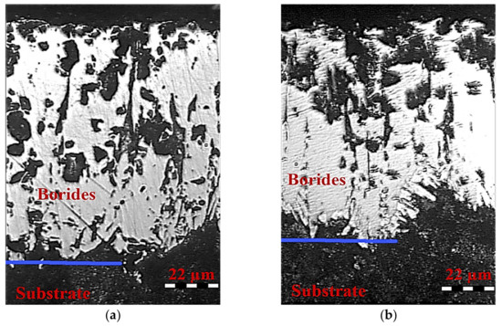 The methods of preventing brittleness include the production of a single-phase layer composed of Fe2B, adjusting the carbon content under the iron boride layer or laser treatment of the borided layer [24]. The carbon content under the iron borides depends on steel chemical composition and may be increased by carburizing prior to boronizing (carboboriding). Laser boronizing is a method where the surface layer of the material is melted together with the alloying material, which is most often preplaced to the surface as a paste mixture containing amorphous boron [25]. The great advantage of this method is the possibility of carrying out the boronizing process locally on the selected surface of machine element [21,26,27]. In [28], Yushkov et al. used electron-beam evaporation of boron-containing targets for boriding. The obtained coating thickness was 3–4 µm.