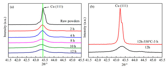 In Figure 3a, it can be clearly visible that the fcc Cu (111) peaks become wider with the increase of milling time. The Cu peaks are broadened by increased milling time since the continuous deformation of powder particles during the milling process results in crystallite refinement and an increase in lattice microstrain, which is consistent with the research of Sheibani [13,30]. In addition, the peak intensity reduction and shift of diffraction angle can be observed, which display the typical behaviors of MA treatment powders. Interestingly, the relative intensity and width of Cu (111) peaks exhibit no significant change with the milling time of 8, 10 and 12 h, indicating that the diffusivity of Cr in Cu substrate becomes slow after MA treatment for 8 h.
