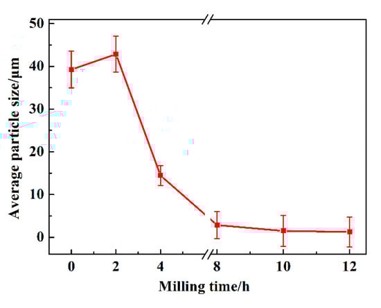 The average particle size changes as a function of milling time are shown in Figure 5. It can be observed that the average particle size of sample milled with 2 h is a little larger than that of raw materials. In addition, MA treatment for 12 h to sample possess the minimum particle size. This result is consistent with that of Figure 4, in which the particle size becomes coarse firstly and then decreases tending to remain unchanged with continued milling. The mentioned phenomena also indicate that the solid solubility increase trend becomes slower after 8 h of milling, which will be estimated in the next part.