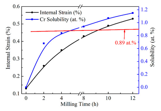 Figure 6 displays the changes in Cr solubility and Cu internal strain concerning milling time. With the increase of milling time, Cr solubility and the internal strain of Cu both increase rapidly, especially at the 4 h of milling time for Cr solubility. The increase of Cu internal strain is mainly due to the refinement of crystallize size, as displayed in Table 2. Crystalize size decreased rapidly up to 4 h of milling time, and slowly decreased from there. However, the lattice parameter increased in a steady-stage during the MA process. In the case of the internal strain, the increase is slow for the entire time of milling, while the Cr solubility increased sharply within the initial 4 h of milling. The slower increase rate after 4 h would be attributed to the diffusion of Cr becoming difficult. In addition, it can be noted that the Cr solubility (1.07 at.%, 1.15 at.%) reach to the usual saturation (0.89 at.%) with milling time more than 8 h. The supersaturated Cu-Cr solid solution powder is prepared successfully with MA treatment for more than 8 h in this work. According to the trace of Cr solubility curve, the Cr solubility tends to increase very slowly or reach a constant with the increase in milling time, as well as the crystallize size.