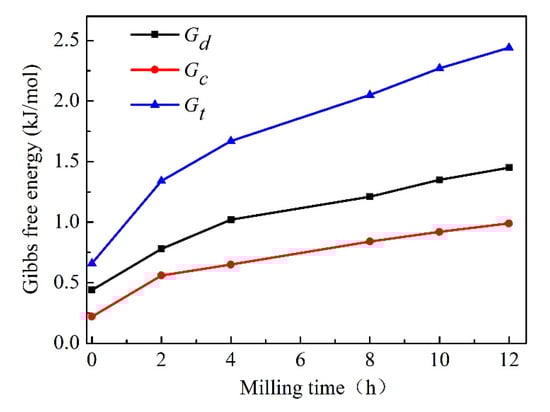 The Gibbs free energy in the Cu-Cr system will change due to the formation of solid solution. As mentioned in Table 2, with the increase of milling time, the typical crystallite size refinement and dislocation density increase can be observed. On one hand, the increment of dislocation density during the milling process would contribute to the total Gibbs free energy (ΔGt). The energy change due to the dislocation density increment, ΔGd, can be calculated by Equation (11) [13]: