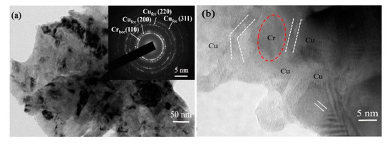 To further understand the atomic structure of supersaturated solid solution Cu-Cr powders, the high-resolution TEM (HRTEM) image was taken, as presented in Figure 8b. It can be observed that several Cu crystallites are distributed around a residual nano-sized Cr crystallite based on the difference of lattice fringe. In addition, Cu grains have evident twins and deformed zone (as indicated by double arrows), which is different from Cr grains. The interface of Cu and Cr (labeled with white dashed line) is ~2–3 nm, which is visible clearly. However, the interface at other regions is ambiguous, this may be caused by Cr atoms dissolving in Cu lattice or by severe deformation after MA treatment, so that two or more grains overlapping.