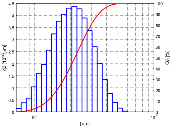 Figure 1 shows the SEM morphology of the powder and Figure 2 shows its size distribution as measured by a Fritsch Analysette 22 NanoTech laser scattering particle size analyzer. The powder that was previously used to print SLM parts was used in the research. The powder particles had a median particle size of cumulative volume distribution x50,3 = 24.28 µm. The minimum and maximum particle sizes were xmin = 8 µm and xmax = 60 μm, respectively, and particles were spherical or quasi-spherical in shape (Figure 1). This shape allowed the particles to flow without hindrance during deposition. The samples for the testing and the sprue spreader were made using the M2 Concept Laser Cusing device. The material was printed in a nitrogen atmosphere with parameters as in Table 3.