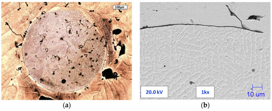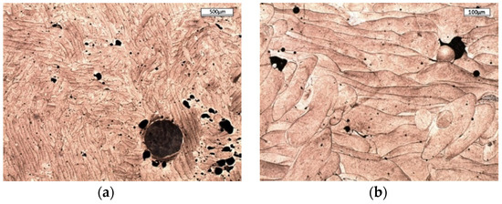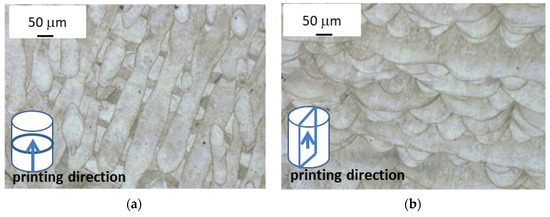 The images of the printed alloy structure in the raw state that were made by using optical microscopy revealed a characteristic feature of the SLM process, namely, the presence of interconnected or overlapping laser beam scanning paths. Depending on the location of the microsection’s plane in relation to the printing direction, the structure images differ, as shown in Figure 3.