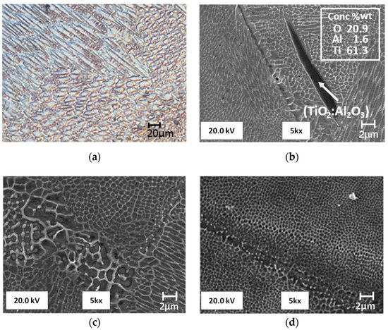 The amount of molten metal in the melting pool is small because its diameter is comparable to the diameter of the laser spot. An extremely large difference between the volume of the molten metal and the surrounding powder or solidified alloy works in favor of good heat conduction. The columnar grain growth depends on the temperature gradient and at high values helps to form a fine-grained structure. This microstructure is significantly different from a typical martensite microstructure, which contains primary austenite grains as well as martensite packages, blocks, and tiles. However, the presence of residual austenite and martensite in the structure was confirmed with the use of the electron back-scattered diffraction (EBSD) method [35]. In the images from a scanning microscope, the alloy structure formed during crystallization is composed of various cell sizes (Figure 4c) in which there are often precipitates that contain mainly Ti. The presence of Ti inclusions or oxides (TiO2:Al2O3) with a size of 10–20 μm was also confirmed by [23], and it worsens the properties of the alloy, especially after aging, making it brittle.