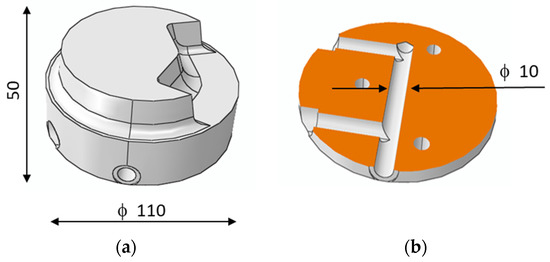 The Computer Aided Design (CAD) model of a spreader with a classic cooling system solution is presented in Figure 11. The diameter of the spreader’s outer profile was 110 mm and its height was 50 mm (Figure 11a) and the cooling channels had a diameter of 10 mm. The length of each of the two shorter channels was 45 mm, while the length of the third cooling channel was 90 mm (Figure 11b).