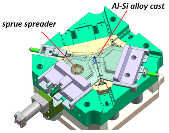 In the classic version, the spreader was made of H13 steel. The cooling channels were drilled using the CNC method. The location of the spreader and the casting in the pressure mold are shown in Figure 12.