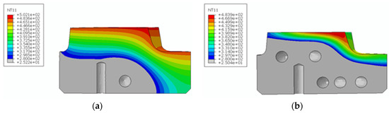 Location of the 280 °C isotherm in the sprue spreader: (a) Usual solution of cooling channels; (b) conformal cooling channels. NT11—temperature in °C.