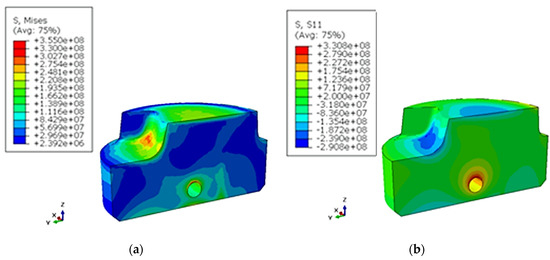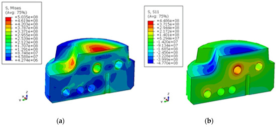 Image of thermal stress [Pa] caused by temperature field changes calculated with FEM directly after injection in a traditional channel system: (a) σo according to Huber–Mises HM hypothesis; (b) stress components σx.