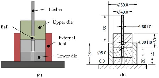 Experimental tests were performed in order to validate the later finite element method (FEM) simulations. The set-up and geometry definition of each part is shown in Figure 2 and Figure 3. The tested specimen consisted of a cylinder with a diameter of 40 mm and a height of 20 mm with an internal hole of 4.962 H7 mm. This hole was drilled with the next manufacturing sequence: drill bit of Ø4.90 mm and three reamer steps of Ø4.935 mm, Ø4.953 mm and Ø4.962 mm. This manufacturing drilling process is a standard in hole drilling in aeronautics. Chamfers at both holes’ ends were machined to avoid misalignments during the cold-expansion process. A 5.000 mm lubricated ball with precision grade G10 (ISO 3290) was forced to pass through the hole with a pusher of 4.8 mm diameter. The pusher displacement was guided with an upper die placed over the specimen. A lower die was fitted to ensure that the ball had enough room to end the test undisturbed. All the parts were aligned with an external tool with outer and inner diameters of 60 mm and 40 mm respectively and they were lubricated with Molykote BR2-PLUS® grease to reduce metal-metal friction between different parts. During the test, the pusher load versus the pusher displacement were measured and registered. Cold expansion process was performed in a Zwick/Roell KAPPA 050 DS testing machine with a load cell Xforce P with a nominal force of 5kN. The pusher displacement was registered with crosshead signals (resolution: 0.1 µm). Contributions of crosshead deformation in the registered displacement was non-significant for the measured load range during the test.