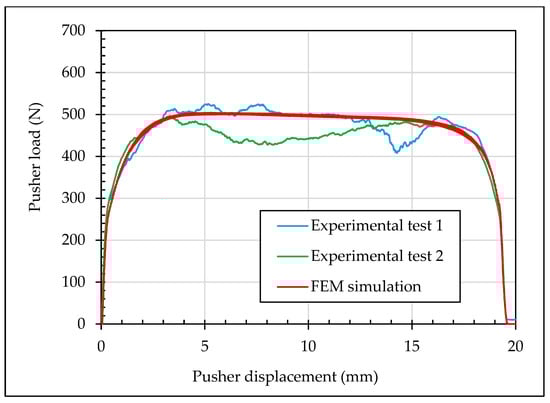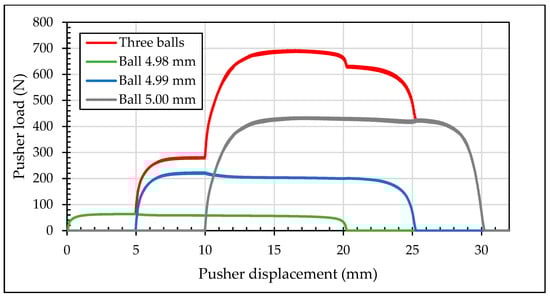 Meshing of the three balls case is presented in Figure 8a. In this simulation, the three balls pass, aligned through the hole, at the same time. At first, only the 4.980 mm diameter ball gets in contact with the specimen. Just after some displacement of the balls, the 4.990 mm diameter ball also gets in contact with the specimen and the necessary pushing load jumps up to a higher value. Finally, the 5.000 mm diameter ball also gets in contact with the specimen. Along some displacement, the three balls are in contact with the specimen. Figure 13 shows the pusher load component for each ball and the sum up of the three balls.