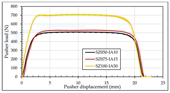 An iterative process was performed to determine the best tapered mandrel geometry in order to obtain the highest residual compressive hoop stresses at inlet and outlet zones after the cold expansion process. This calculation was executed considering a similar level of pushing loads needed for the process (comparing with cold expansion performed with a single ball geometry; around a maximum load of 500 N). From Reference [13], it was deduced that an increment of the length of the straight zone or a reduction of the inlet angle increase the pushing load. In this iterative process, three different SZs were evaluated (SZ = {0.50, 0.75, 1.00} mm) obtaining the appropriate IA to reach the most similar pushing load (IA = {1.0, 1.5, 5.0}°). Figure 8b shows the FEM model used for this iterative process. Figure 10 represents the pushing load for the three evaluated cases, where case with SZ = 1.00 mm showed extreme loads unable to be reduced by increments of the IA. Thus, in order to compare cold expansion processes with similar pushing loads, the SZ should not be higher than 1.00 mm.