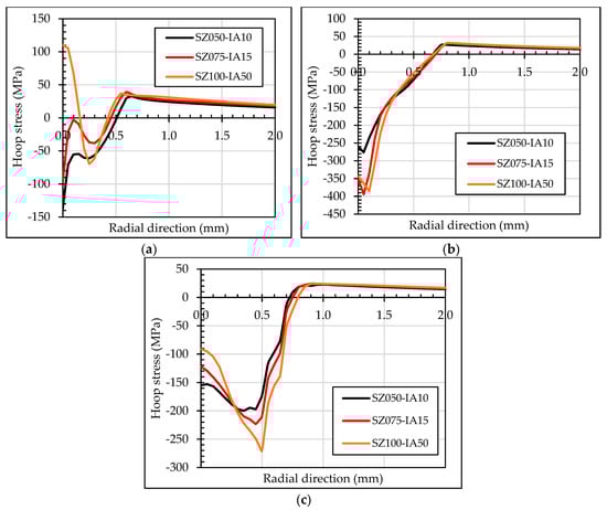 Residual hoop stresses in radial section at (a) inlet zone; (b) middle section; (c) outlet zone.