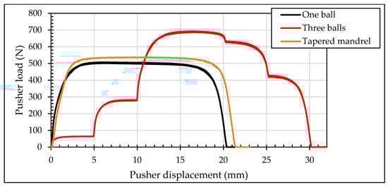 Figure 12 shows the pushing loads during the cold-expansion process of the three simulations with one ball, three balls and tapered mandrel. Required loads for the process with three balls were stepped as each ball contacted the specimen. Required loads for the process with tapered mandrel were intentionally delimited as described previously.