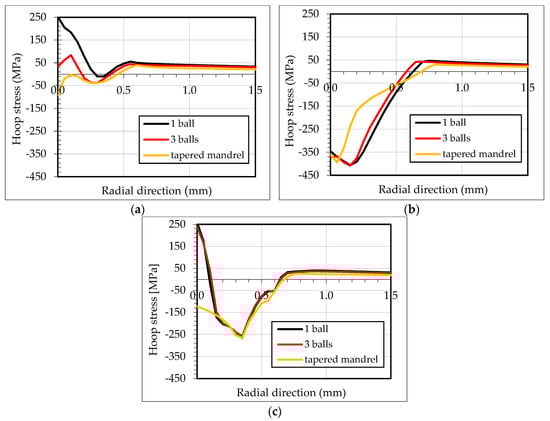 Residual hoop stresses in radial section at (a) inlet zone; (b) middle section; (c) outlet zone for tapered mandrel geometry evaluation.