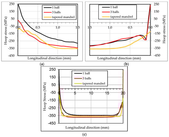 Figure 15 shows the distribution of residual hoop stresses along the first (Figure 15a) and the last (Figure 15b) 1.5 mm in the longitudinal direction at the hole radius. Figure 15c shows the residual hoop stress distribution along full longitudinal distance. In the first 1.5 mm, the simulation with one ball showed 0.2 mm area of tensile residual hoop stresses, while using tapered mandrel generated compressive residual hoop stresses. Simulation with three balls showed that magnitude and the affected area with tensile hoop stresses were reduced significantly compared with one ball set-up. In the last 1.5 mm, the simulation with one and three balls showed similar results with high residual tensile hoop stresses in the last 0.05 mm of the specimen, while the simulation with tapered mandrel showed again compressive residual hoop stresses.