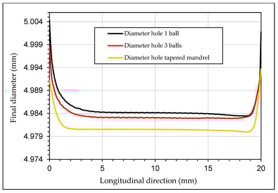 The second part of this investigation involved FEM simulations based on the previously validated model. A similar hole diameter of 4.974 mm and different gadgets (mandrel and balls) were used. Three simulations were performed and compared (see Figure 7):