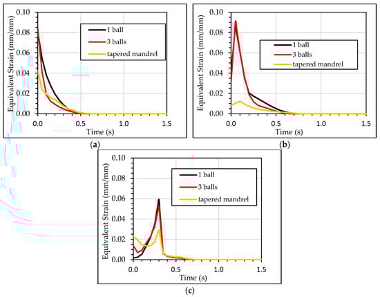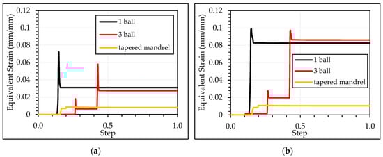 Figure 17 shows the equivalent plastic strain stresses along the first 1.5 mm in the radial direction at three locations: the inlet zone, the outlet zone and the middle section. Tapered mandrel case showed lower values of the equivalent plastic strain, with a significant difference in the middle section. Figure 18 shows the evolution of the equivalent plastic strain in a mesh element in the location of the hole radius and in a section where the influence of inlet and outlet zones were neglected. When the ball or balls contacted this mesh element, the equivalent plastic strain was increased. When the ball displacement progressed, the contact between the ball and the mesh element disappeared. In that moment, the equivalent plastic strain in the mesh element was reduced. In the first of the balls in the three balls simulation, no significant plastic strain was generated. This is explained by the low interference level for this first ball. Tapered mandrel simulation showed a different behavior. For the same level of interference, the equivalent plastic strain values are very low compared with the balls’ simulations and it showed low equivalent plastic strain reduction after the mandrel contact.