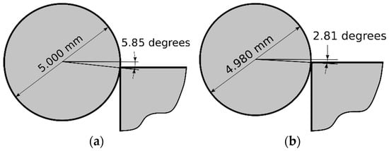 This investigation evaluated if this inlet angle was one of the parameters that affected to the distribution of the residual hoop stresses at the inlet zone. For the 5.000 mm diameter ball, the contact angle ranges from 5.85° to 0° (see Figure 20a) and for the 4.980 mm diameter ball, it ranges from 2.81° to 0° (see Figure 20b). Calaf-Chica et al. [13] showed the importance of the inlet angle for tapered mandrels and similar importance was expected for balls. The use of different balls’ diameters in sequential substeps would reduce the inlet contact angle.