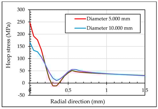 From each simulation, residual hoop stresses along the radial direction were obtained for the inlet zone, middle section and outlet zone of the hole (see Figure 9).