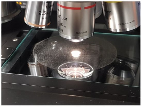 Particle size analysis on the powder samples was performed using a Malvern Mastersizer 3000 (Malvern Panalytical UK, Malvern, UK), fitted with an Aero S solid dispersion unit (Malvern Panalytical UK, Malvern, UK) and a stainless-steel venturi hopper plate dispenser (Malvern Panalytical UK, Malvern, UK). Pressure was maintained in the range 0.5–1 bar, and feed rate was varied between 7–20%. Occlusion values were maintained in the range of 0.5–6%. All powder samples were thoroughly mixed by manually rotating the sample container top-over-bottom 30 times before withdrawing the powder aliquot required for the test. Data were recorded in terms of the % volume distribution against particle size using a spherical model approximation. In all cases, an average and standard deviation were calculated. The shape and morphological properties of the powder particles were investigated using a Malvern Morphologi G3 (Malvern Panalytical UK, Malvern, UK). For this, a 3 mm3 volume of metal powder was dispersed under 1 bar pressure onto a glass slide using compressed air. These volume and pressure settings were found to give an acceptable dispersion, where particles were sufficiently well separated from each other to enable identification and measurement of individual particles using the image recognition software in the Morphologi G3 (Morphologi Version 8.23, Malvern Panalytical UK, Malvern, UK). Where particles were irregular or appeared to overlap, they were either discounted from the subsequent analysis or further in situ analysis using variable focus stacking was conducted to distinguish between overlapping and irregularly shaped particles. Four scan areas were chosen, and the instrument identified between 100,000 and 400,000 particles in each sample, see Figure 2 for experimental setup. The circularity was measured as defined in Equation (4):