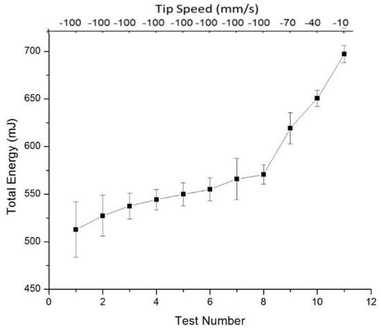 The results of eleven Variable Flow Rate (VFR) and Stability fluidity tests for Powder A are shown with the total energy noted versus the test number and tip speed. The negative sign for tip speed is a convention denoted tip direction. Three separate, random test samples of Powder A were analysed. The three runs were averaged and 95% CI bars are shown.