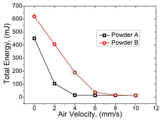 The results of the aeration test are shown in Figure 4, in which the torque experienced by the blade rotating within the powder is evaluated at different air velocities. Powder A and B exhibit markedly different flow behaviours at lower air velocities and by analysing the results, it can be seen that powder A has a value of minimum fluidisation velocity at 4.00 mm/s with powder B exhibiting complete fluidisation at 8.00 mm/s. At higher air velocities (>6 mm/s), both exhibit almost zero flow energy and exhibit AE_10 values of <10 mJ at air velocities >8 mm/s.