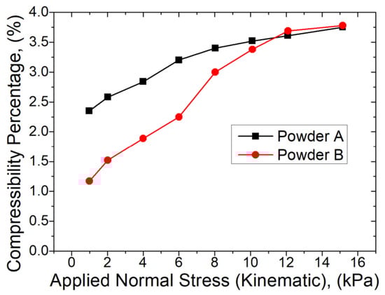 In the compressibility test, the variation of the powder density is calculated as a function of increasing applied normal stress. Compressibility is directly influenced by many factors such as particle size distribution, shape, texture and cohesivity [44].