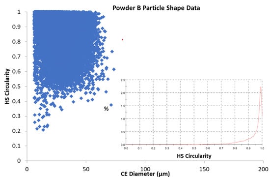 As noted, both powders exhibit high circularity across their respective particle size distributions, shown in Figure 7 and Figure 8, which illustrate a scatter plot of each particle’s circularly equivalent (CE) diameter with its calculated Circularity (Equation (1)). The scatter plots demonstrate that both powders have Circularity values approaching 1 and are therefore considered to be highly spherical. Powder B appears to have more irregularly shaped particles (High Sensitivity (HS) values < 0.4) than Powder A has, and this is more noticeable for the smaller particles (<20 µm). The inset graphs in each figure show smoothed graphs of the data for each of the possible HS Circularity gradations (0–1.0) and these correlate with the parent data, a longer tail is seen for Powder B around 0.8–0.9 and this is taken to indicate that this powder, while quite spherical, has marginally lower sphericity (0.94) than that of Powder A (0.97), based on the particles measured for each sample. It is important to point out that approx. 128,000 particles of Powder A were analysed and used for the calculations, while a smaller sample size (some 28,000) particles of Powder B were analysed. It is possible that this may account for some of the differences observed, it could be assumed that given the similar Laser Diffraction Scattering (LDS) measurements, a larger number of particles would mean a greater number of fines in the sample and this is in agreement with the LDS results. Therefore, the experimental sample still has a greater sphericity value globally. Table 3 shows the relevant calculated values for the powders.