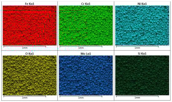The electron microscopy analysis confirmed that the majority of the particles observed are highly spherical and possess a strongly homogenous elemental composition (Figure 10) In Figure 9a,b, a poly-dispersion of particle sizes is seen, with Powder B particles being more irregularly shaped in nature. Some satellite particles were also observed. However, the size and shape of the particles shown in Figure 9 appear to correlate well with the Particle Size Distribution (PSD) data, HS Circularity, aspect ratio and Circular Equivalent Diameter (CED) values of the particles as calculated from the visual microscope images used for the shape analysis investigation (Figure 7 and Figure 8). Indeed, the HS Circularity value for Powder B is lower than for Powder A (0.94 vs. 0.97), indicating that the small sample sets in Figure 7 and Figure 8 are suitably representative of the bulk powder (averaged across 100–200 K particles).
