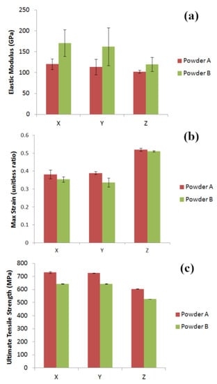 (a) Elastic moduli of parts produced using Powders A and B in X, Y and Z build orientations; (b) Max strain values exhibited by dogbone samples produced using Powders A and B as feedstock and (c) UTS values for samples from Powders A and B. Error bars are based on 95% confidence intervals.