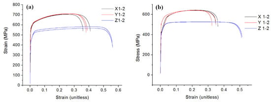 Stress–strain curves for the tensile samples produced via L-PBF using (a) Powder A and (b) Powder B, as feedstocks.