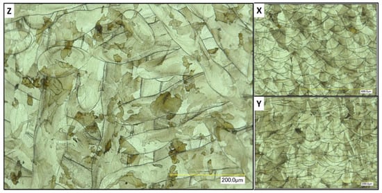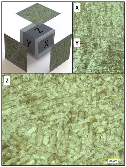 Illustration of micro-sections of cube printed with Powder B. Scale bars are (X) 400 μm, (Y) and (Z) 200 μm. X, Y and Z refer to the faces of the cube in relation to the melt pool (Z).