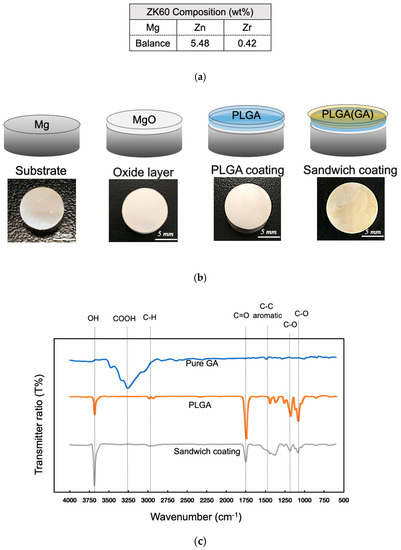 Composition of ZK60 (a) [34], the steps in the dip-coating procedure (b), and FT-IR spectra of GA, PLGA, and the sandwich coating (c).