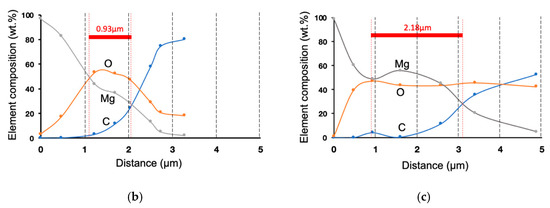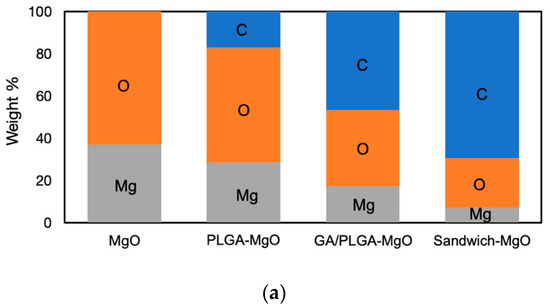 EDS detection confirmed that the sandwich layers covered the bare ZK60, as shown in the elemental distribution in Figure 3a. In the MgO layer, magnesium and oxygen accounted for 36.9% and 63.1%, respectively, while in the final sandwich coating film, Mg and oxygen (O) accounted for 7.2% and 23.4%, respectively, with the balance being carbon (C). The decreases in the contents of Mg and O with the layers verified that the PLGA coating protected the MgO surface. Furthermore, the rising C contents of GA and PLGA indicated bare Mg substrate was covered by the coating. Next, an EDS line scan was applied to analyze the elemental changes in the sandwich coating (Figure 3b,c). Based on the changes in the ratios of the element weights, the highest content of Mg was in the ZK60 region. Due to the rich oxygen contents of MgO, GA, and PLGA, the increasing O and declining Mg contents indicated the MgO layer and sandwich coating. Furthermore, the rising carbon signal originated from the mounting epoxy resin. The film thickness observed in the SEM images was consistent with the EDS analysis measured from the first Mg–O crossing point to the second Mg–C crossing point in the PLGA and sandwich coating films.