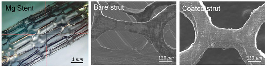 Mg-stent prototype, and the SEM images of the bare strut and sandwich-coated strut.