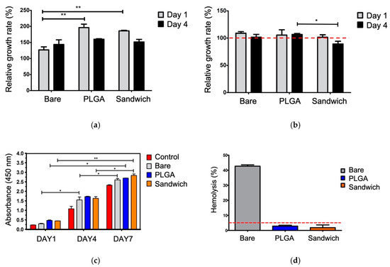 Based on the cell viability of the ECs and SMCs, there were two notable points: the non-toxic growth rate of sandwich coating towards ECs, and the selective suppression of SMCs (Figure 6a,b). In comparison to bare ZK60, the PLGA and sandwich coatings exhibited significant viability in ECs. The SMCs exhibited proliferation in the PLGA group, while sandwich coating only had 90% viability after four days. Even though the proliferation of the ECs declined on Day 4, the decline could have been due to the high content of GA released in a static environment. The efficiency of GA, while not significant in the SMCs, was moderate in strength. These results indicated that the ECs had a robust proliferation growth rate of 150% compared to the SMC group, and sandwich coating inhibited SMC over-growth. None of the groups exhibited toxicity in the comparison tests; thus, the four-day test was sufficient to observe the growth trend, while a seven-day test would have soon reached 100% coverage and lost the trend in our relative growth study.