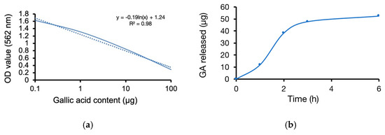 The anti-oxidation analysis of (a) the DPPH/GA efficiency curve, (b) the sandwich coating film release GA curve and (c) free radical scavenging activity (*** p < 0.001, mean ± SD, N = 6).